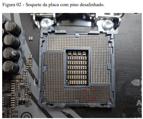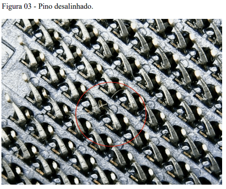 APÓS A KABUM NEGAR O RMA, AINDA ME ENVIAM UM TERMO DE CONSTATAÇÃO, ALEGANDO “DESALINHAMENTO” (TERMO TÉCNICO PARA AMASSAR) UM PINO (UM ÚNICO PINO, CONFORME FOTO ABAIXO, RETIRADA DO TERMO DE CONSTATAÇÃO ENVIADO PELA KABUM) DO SOCKET DA PLACA MÃE, ASSIM CAUSANDO O DEFEITO E NEGANDO O RMA. AFINAL, PARECE-ME HUMANAMENTE IMPOSSÍVEL “DESALINHAR” APENAS UM PINO DE UM SOCKET INTEL Z390 NA POSIÇÃO QUE A FOTO MARCA, FACE AO TAMANHO DO MESMO, POSSIVELMENTE (SALVO ENGANO MEU) SENDO UM VÍCIO OCULTO (AFINAL, NINGUÉM PEGA UMA LUPA ASSIM QUE RECEBE UMA PLACA MÃE NOVA E FICA OLHANDO PINO POR PINO DAS CENTENAS DE PINOS DO SOQUETE, ATÉ PORQUE PRESUME-SE QUE NÃO HAJA TAL NECESSIDADE).