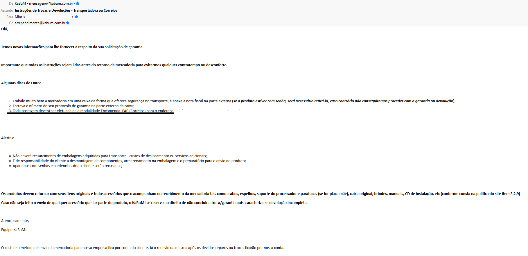 PRINT QUE COMPROVA A OBRIGATORIEDADE DE ENVIO VIA CORREIOS (PAC) conforme grifado. Endereço a ser enviado omitido por questão de privacidade da empresa. Meu e-mail pessoal omitido pela minha privacidade.