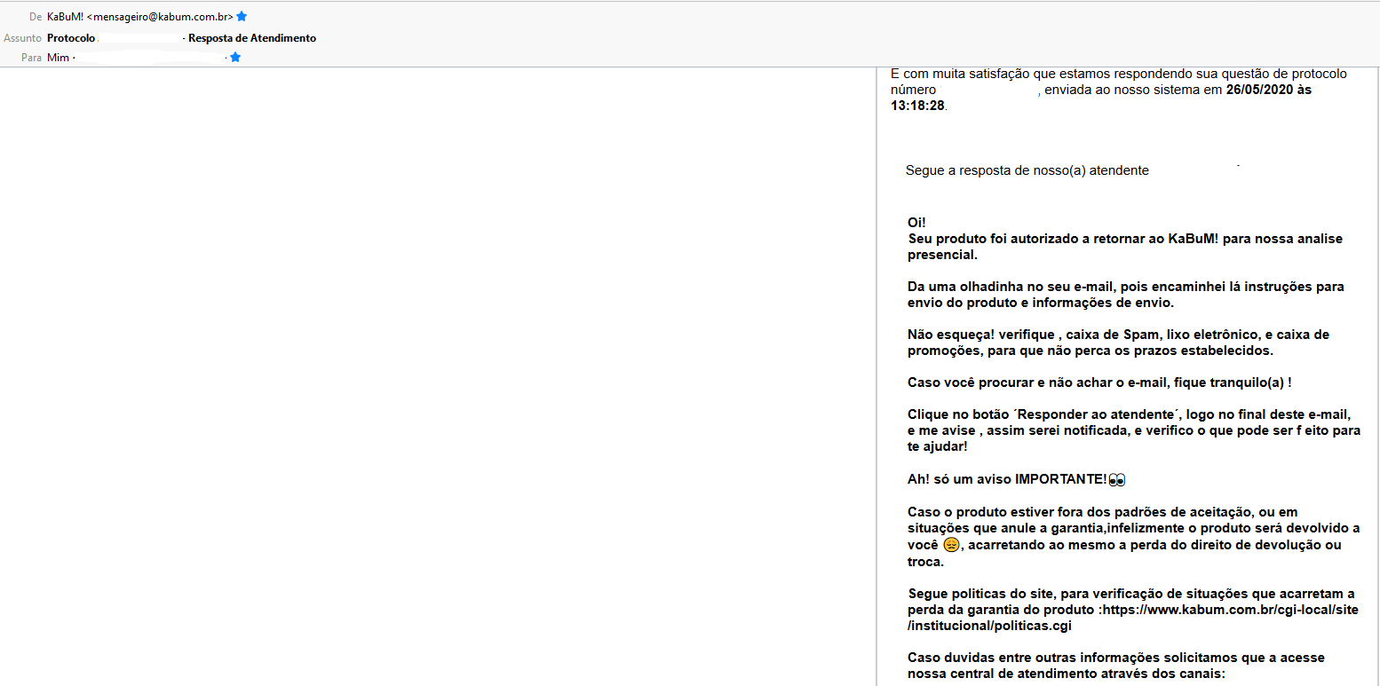 Abri, na KaBuM, o chamado de garantia no dia 08/05/2020, tendo em vista que a garantia iria até o dia 23/05/2020, ou seja, ainda tinha alguns dias para o processo.